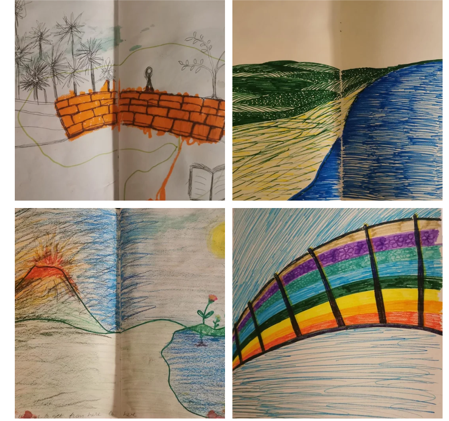 Some of the artwork created in our workshops. Each activity was followed by CBT based questionnaire. Each activity is saved and these are used to track progress and to compare any repeat work undertaken at a later stage.